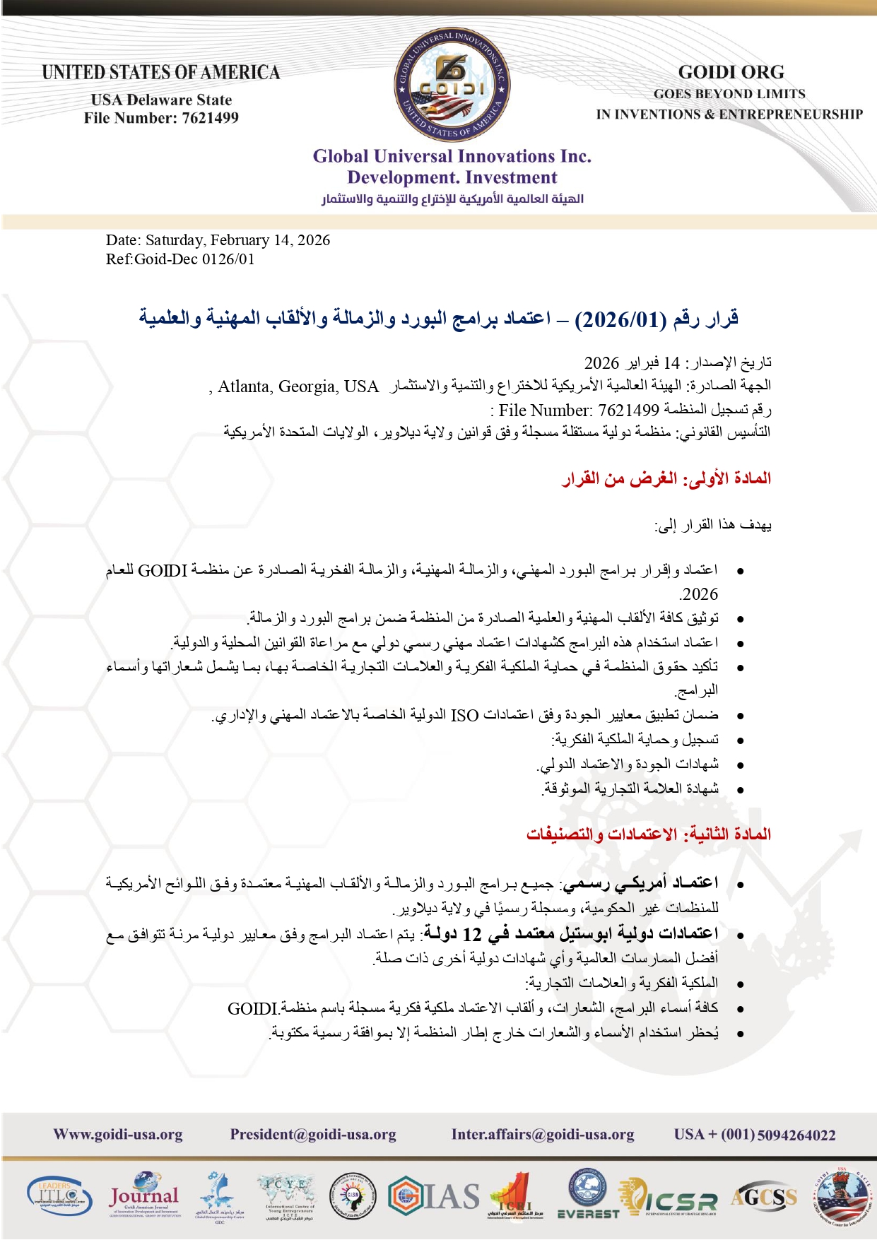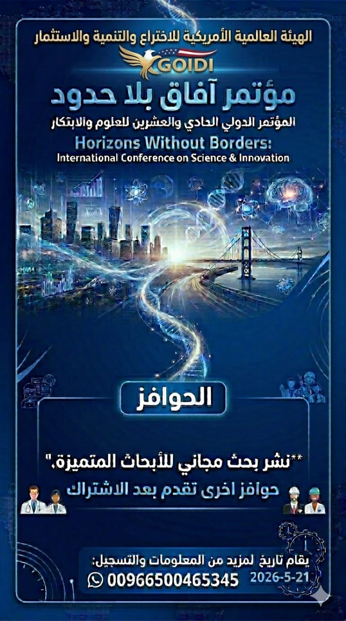 المرجعية العليا: دخول "2026 Master Charter" 🎉 إطلاق بروتوكول النشر العلمي الدولي 2026 🎉 الهيئة العالمية الأمريكية للاختراع والتنمية والاستثمار Global Universal Innovation Inc (GOIDI) تُطلِق أول مبادرة عالمية وتؤسس أول كيان علمي دولي بمسمى مجلس عمداء البحث العلمي والاختراع الدولي 🎉 الهيئة العالمية للابتكار الشامل للتطوير والاستثمار تعلن رعايتها لمعرض SDGITEX 2025 في نيجيريا 🎉 Global Universal Innovation, Inc. Development & Investment Sponsors SDGITEX 2025 in Nigeria 🎉 تم إعتماد برامج البورد والزمالة الآمريكية اعتبارا من عام 2026