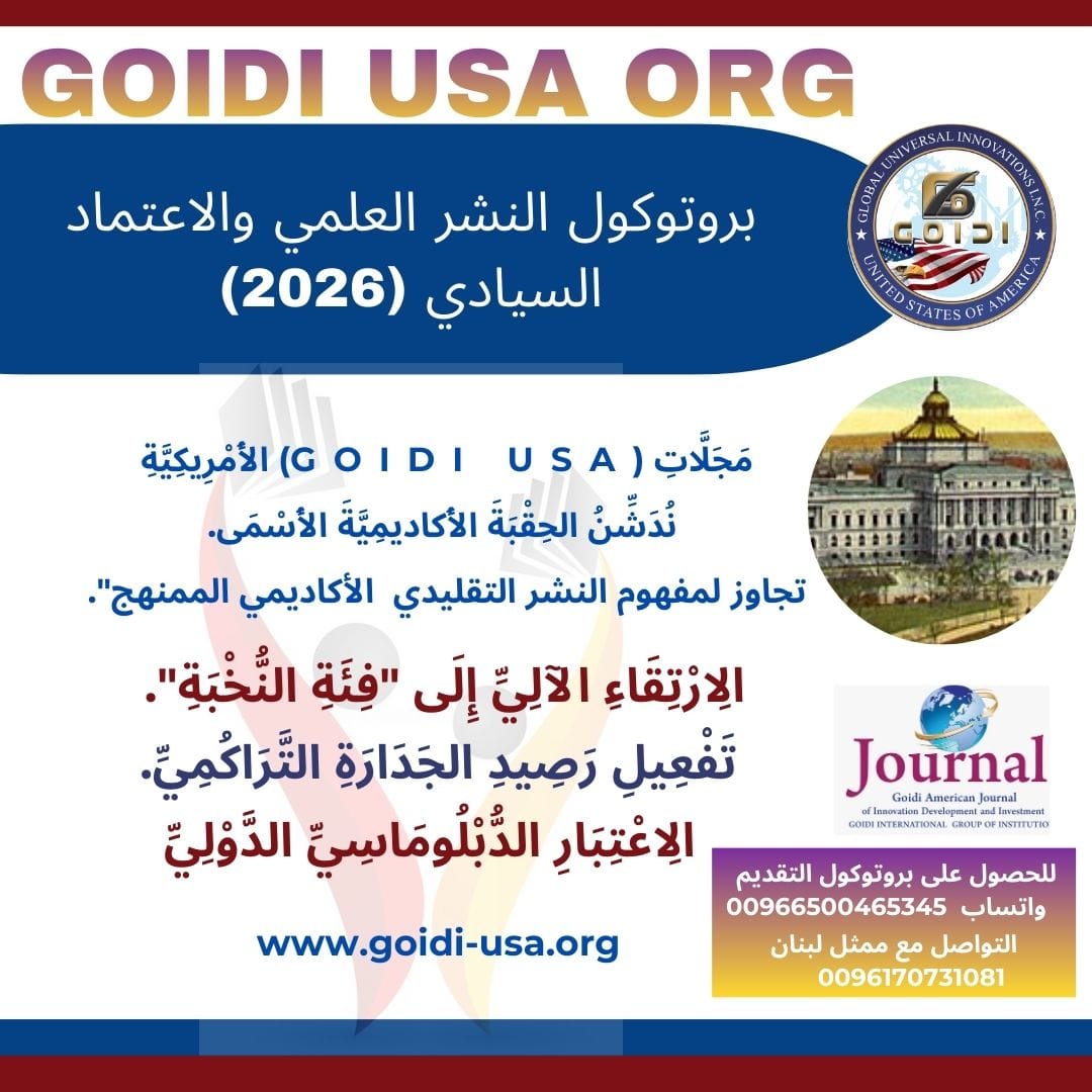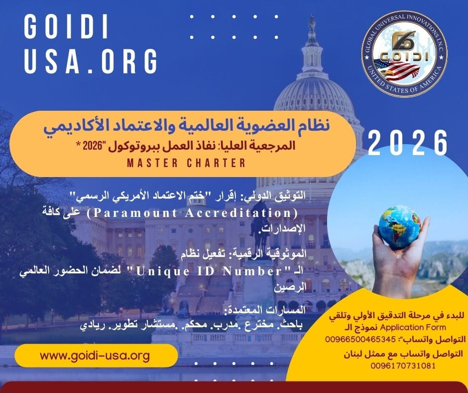 المرجعية العليا: دخول "2026 Master Charter" 🎉 إطلاق بروتوكول النشر العلمي الدولي 2026 🎉 الهيئة العالمية الأمريكية للاختراع والتنمية والاستثمار Global Universal Innovation Inc (GOIDI) تُطلِق أول مبادرة عالمية وتؤسس أول كيان علمي دولي بمسمى مجلس عمداء البحث العلمي والاختراع الدولي 🎉 الهيئة العالمية للابتكار الشامل للتطوير والاستثمار تعلن رعايتها لمعرض SDGITEX 2025 في نيجيريا 🎉 Global Universal Innovation, Inc. Development & Investment Sponsors SDGITEX 2025 in Nigeria