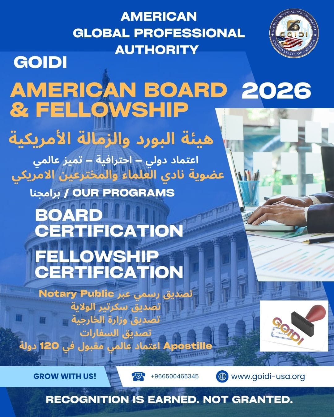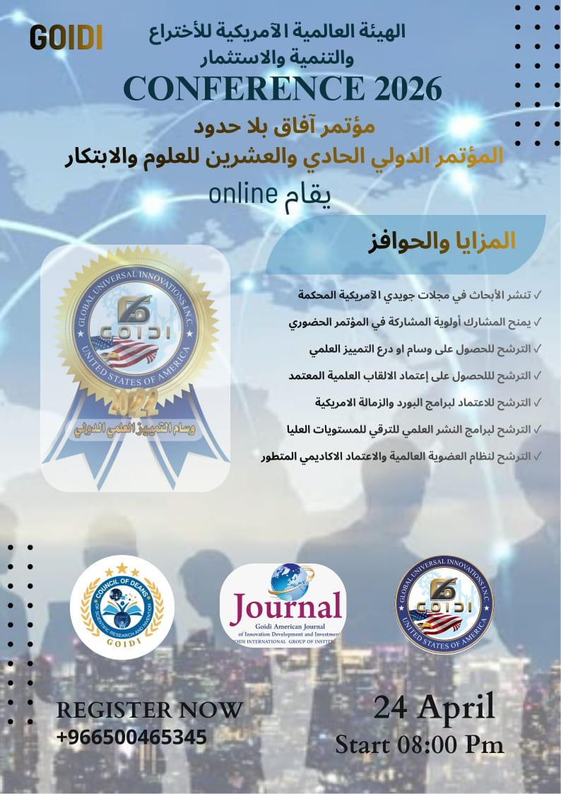 المرجعية العليا: دخول "2026 Master Charter" 🎉 إطلاق بروتوكول النشر العلمي الدولي 2026 🎉 الهيئة العالمية الأمريكية للاختراع والتنمية والاستثمار Global Universal Innovation Inc (GOIDI) تُطلِق أول مبادرة عالمية وتؤسس أول كيان علمي دولي بمسمى مجلس عمداء البحث العلمي والاختراع الدولي 🎉 الهيئة العالمية للابتكار الشامل للتطوير والاستثمار تعلن رعايتها لمعرض SDGITEX 2025 في نيجيريا 🎉 Global Universal Innovation, Inc. Development & Investment Sponsors SDGITEX 2025 in Nigeria 🎉 تم إعتماد برامج البورد والزمالة الآمريكية اعتبارا من عام 2026